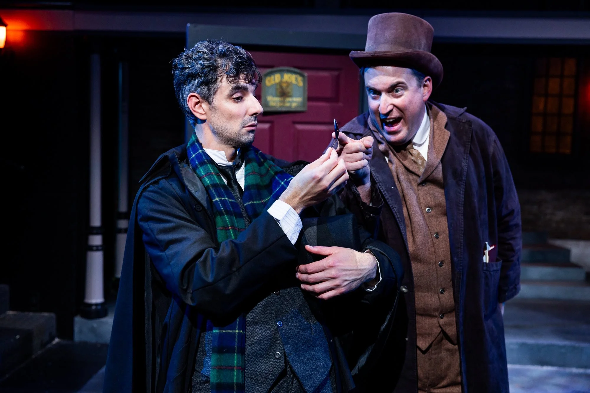 Image credit: Nile Scott. Image description: Paul as Sherlock Holmes investigates Scrooge’s murder by speaking with street peddler Old Joe (Mark Linehan).